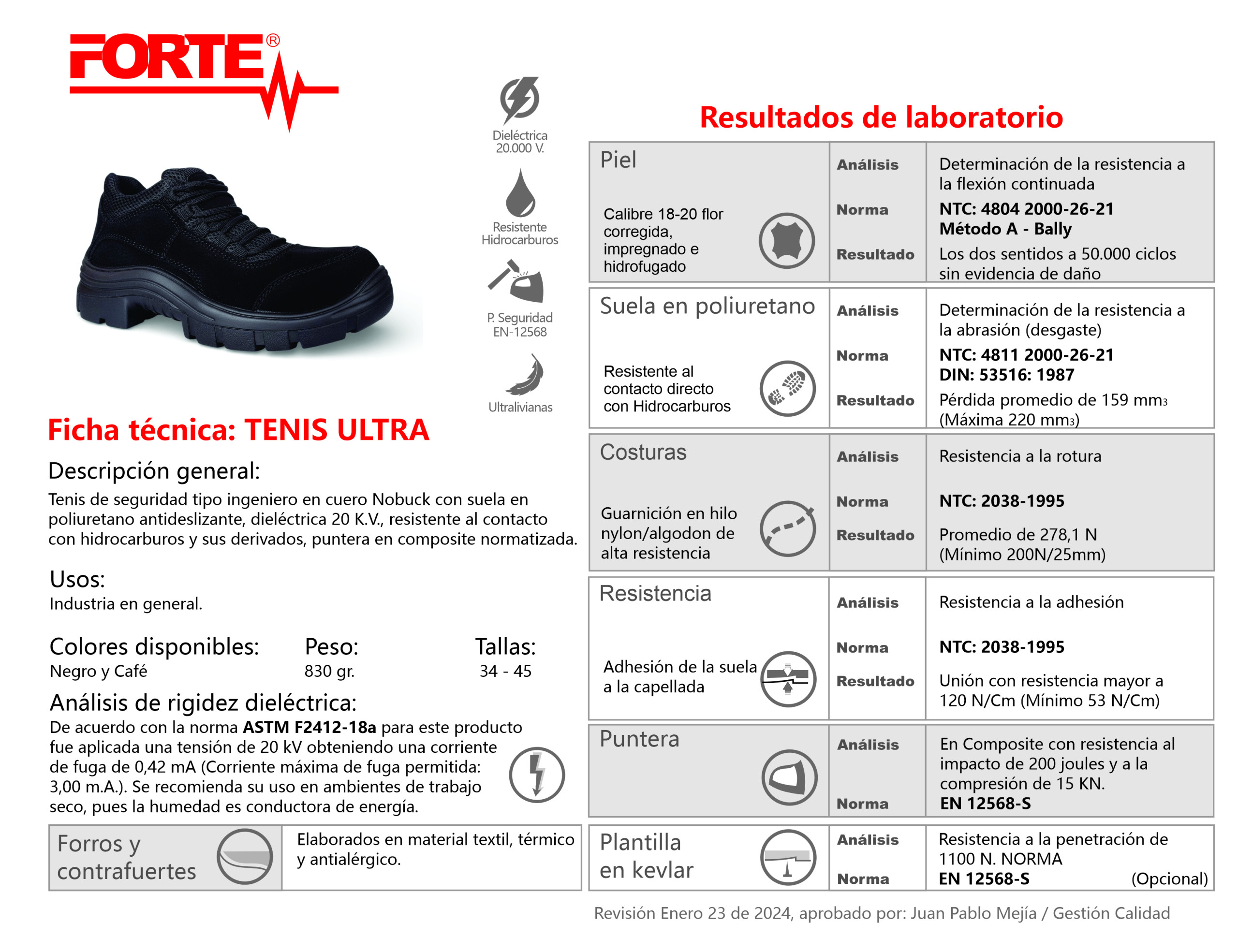 | Cuero | Nobuck o Graso calibre 18-20 hidrofugado e impregnado (Norma NTC 4804) |